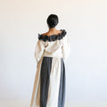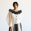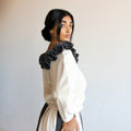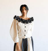 Our Made to Order Sweet Ruffle Blouse inspired by vintage ruffles. The blouse features a beautiful ruffle neckline, curved sleeves, button closure at centre front and fastened with corozo nut buttons.