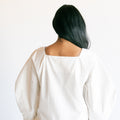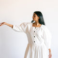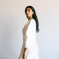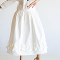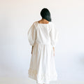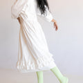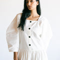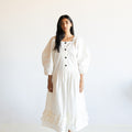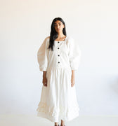 Our Made to Order Sweet Fringe Dress. The dress features our classic square neckline, curved elbow length sleeves, a double frill at hem, button closure at centre front and fastened with corozo nut buttons.