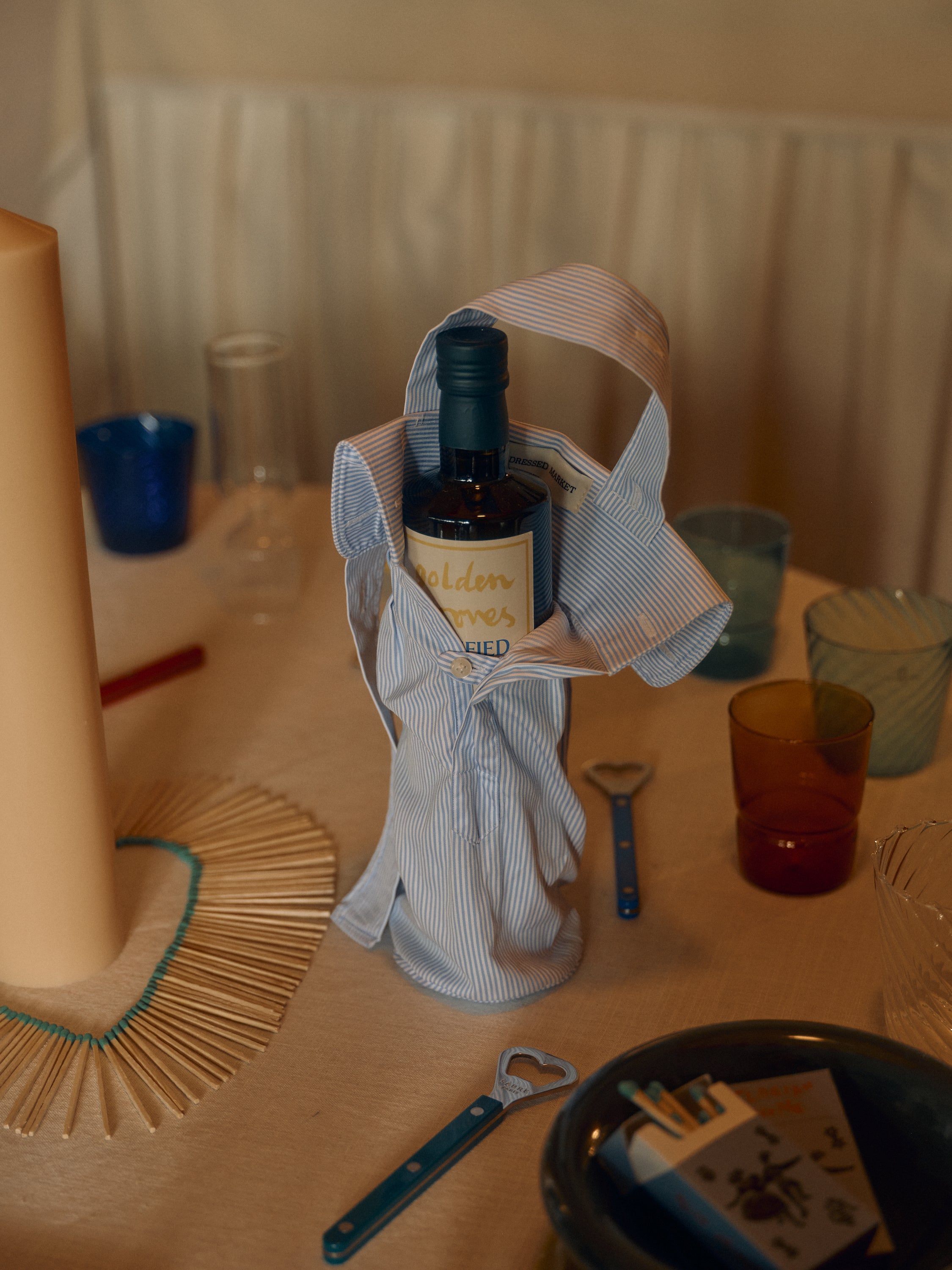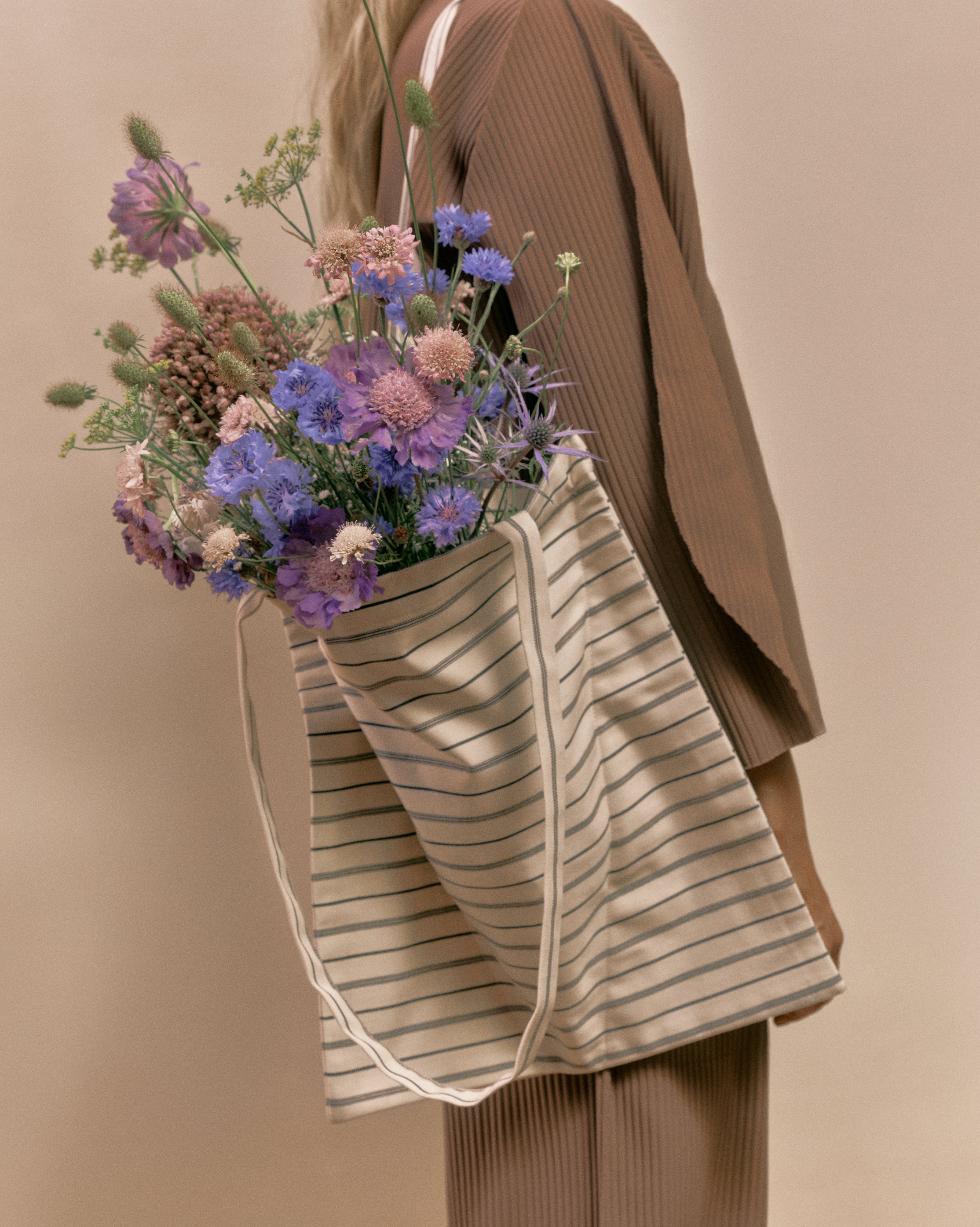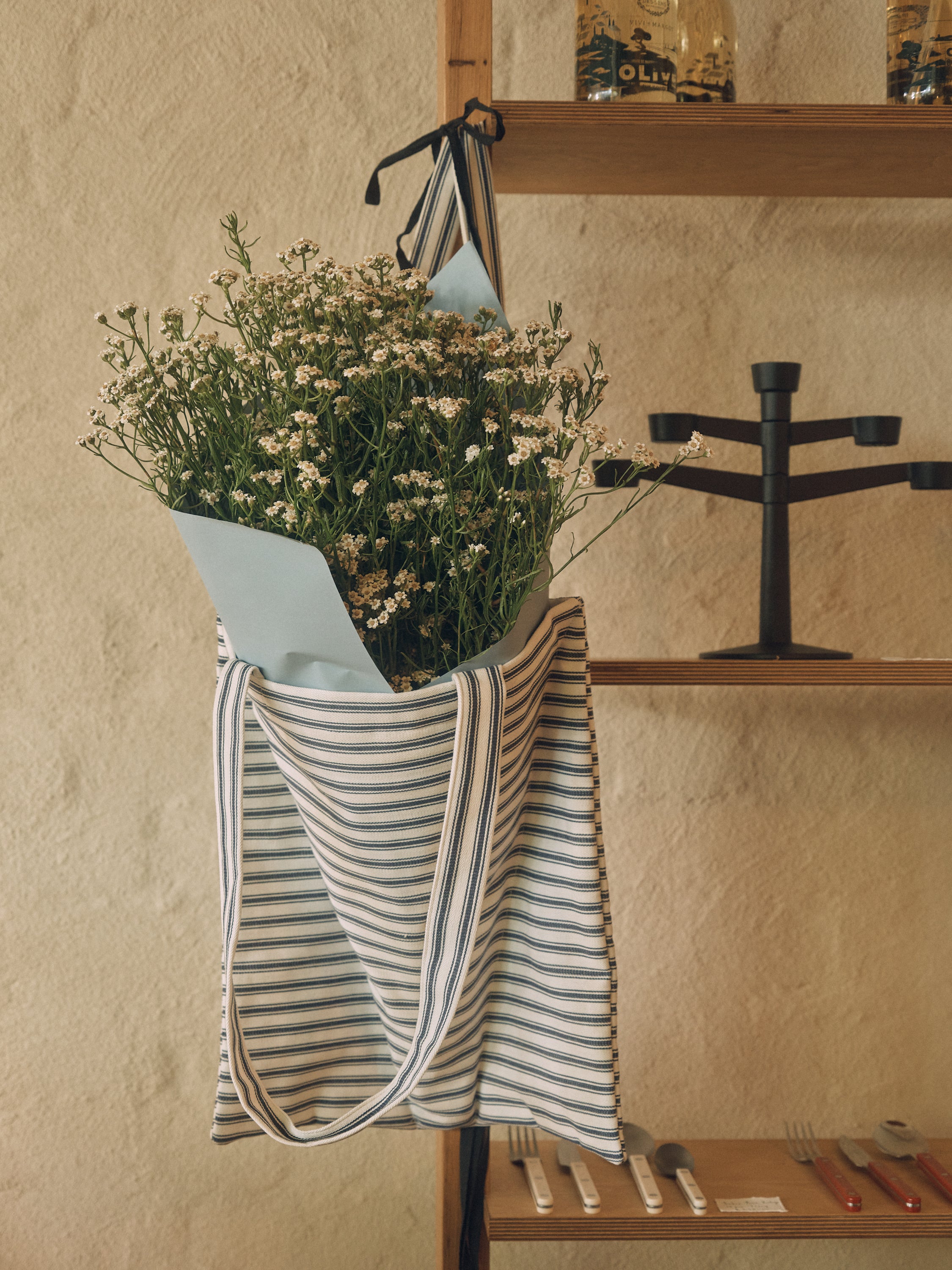 For the event, Kateri created a wine bag made from recycled shirting in collaboration with Undressed, and a flower bag designed with Braer — pieces intended to accompany flowers, food and shared moments around the table.