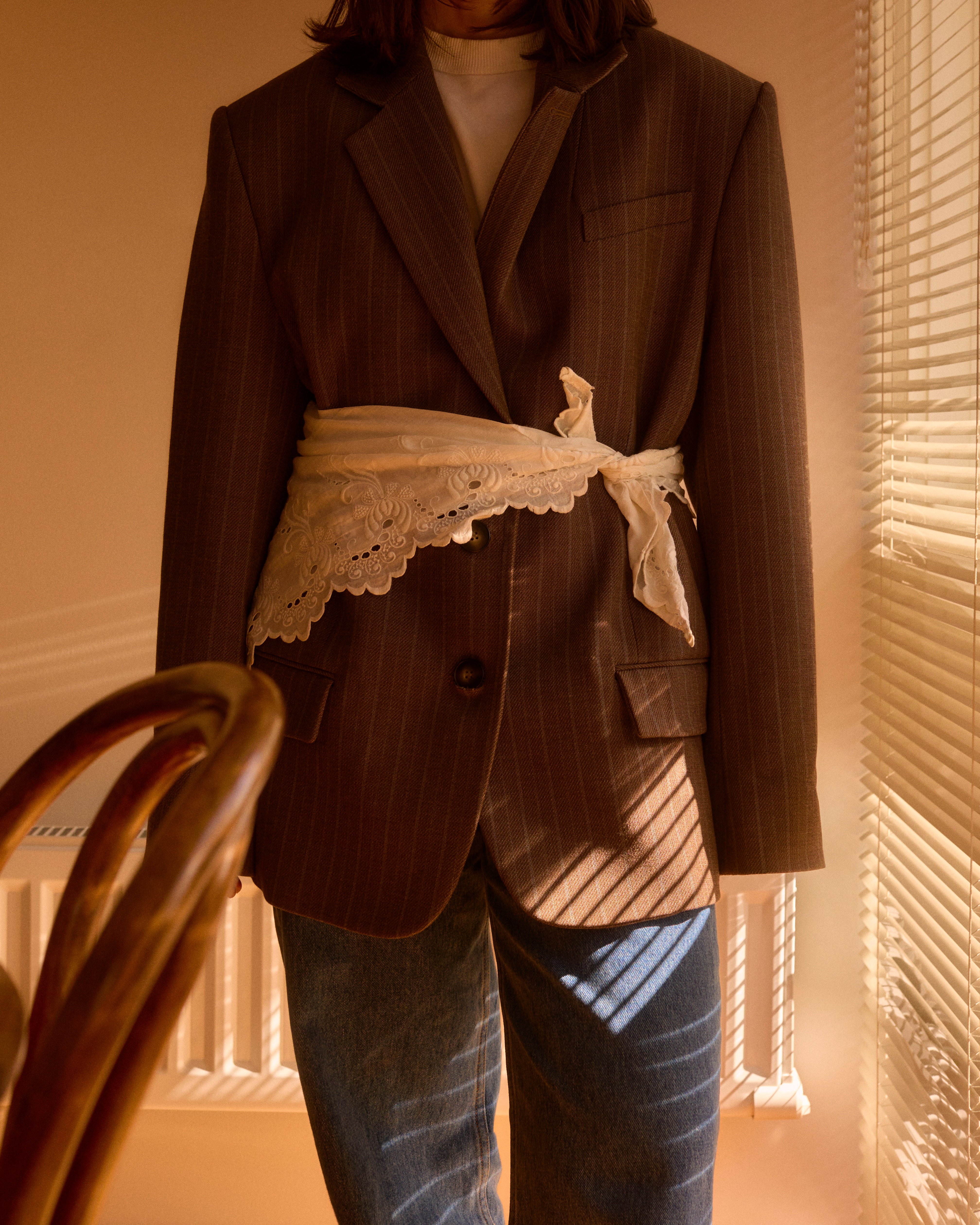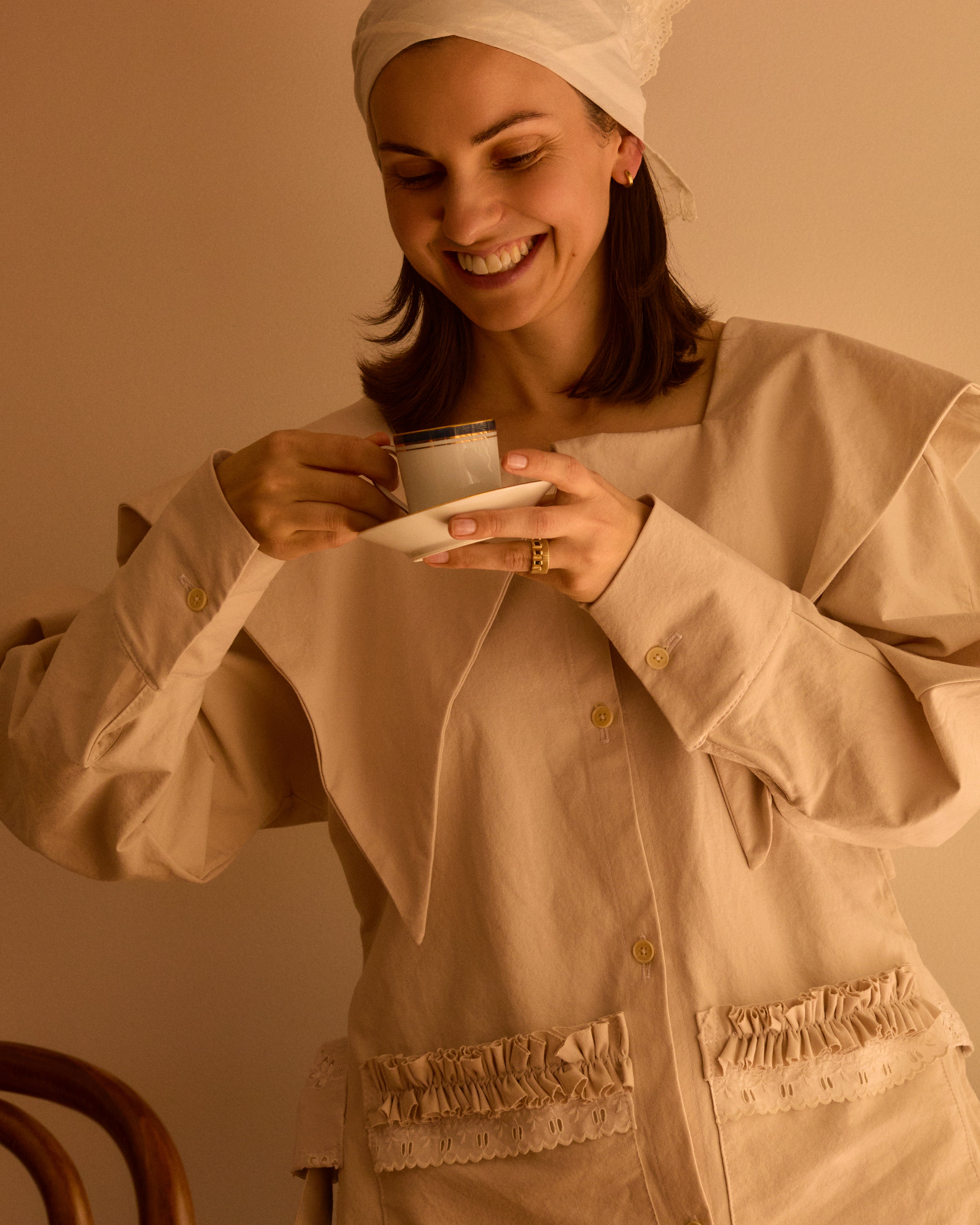 Designed in collaboration with Ruby Farley-Steere, founder of Kateri the Label, each piece was handmade to order in Melbourne using organic cotton and recycled lace. The collection explored pieces that could shift between roles — a headscarf worn as a neckerchief or napkin, a waist apron doubling as a carry-all.