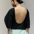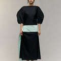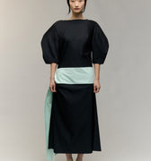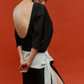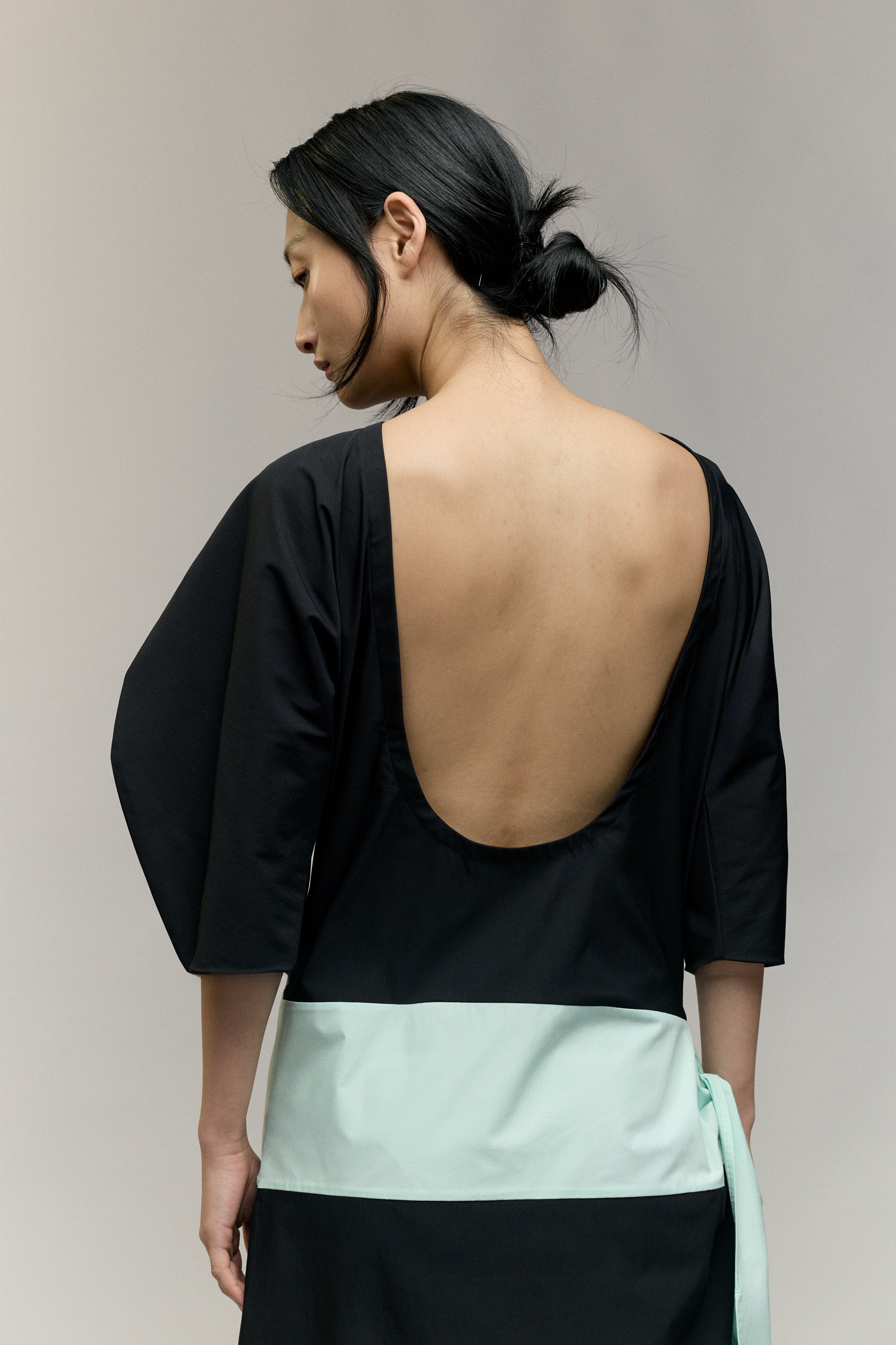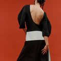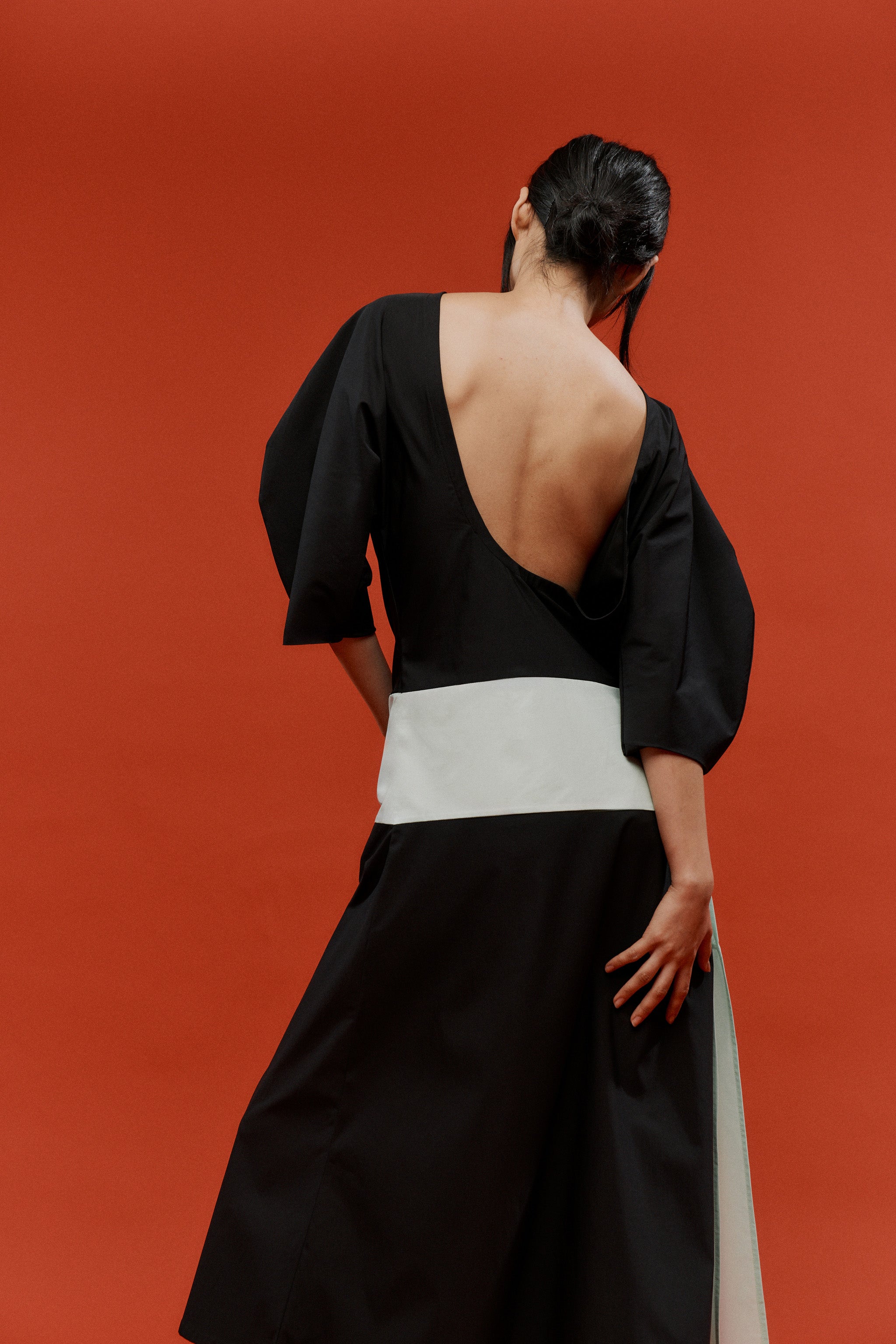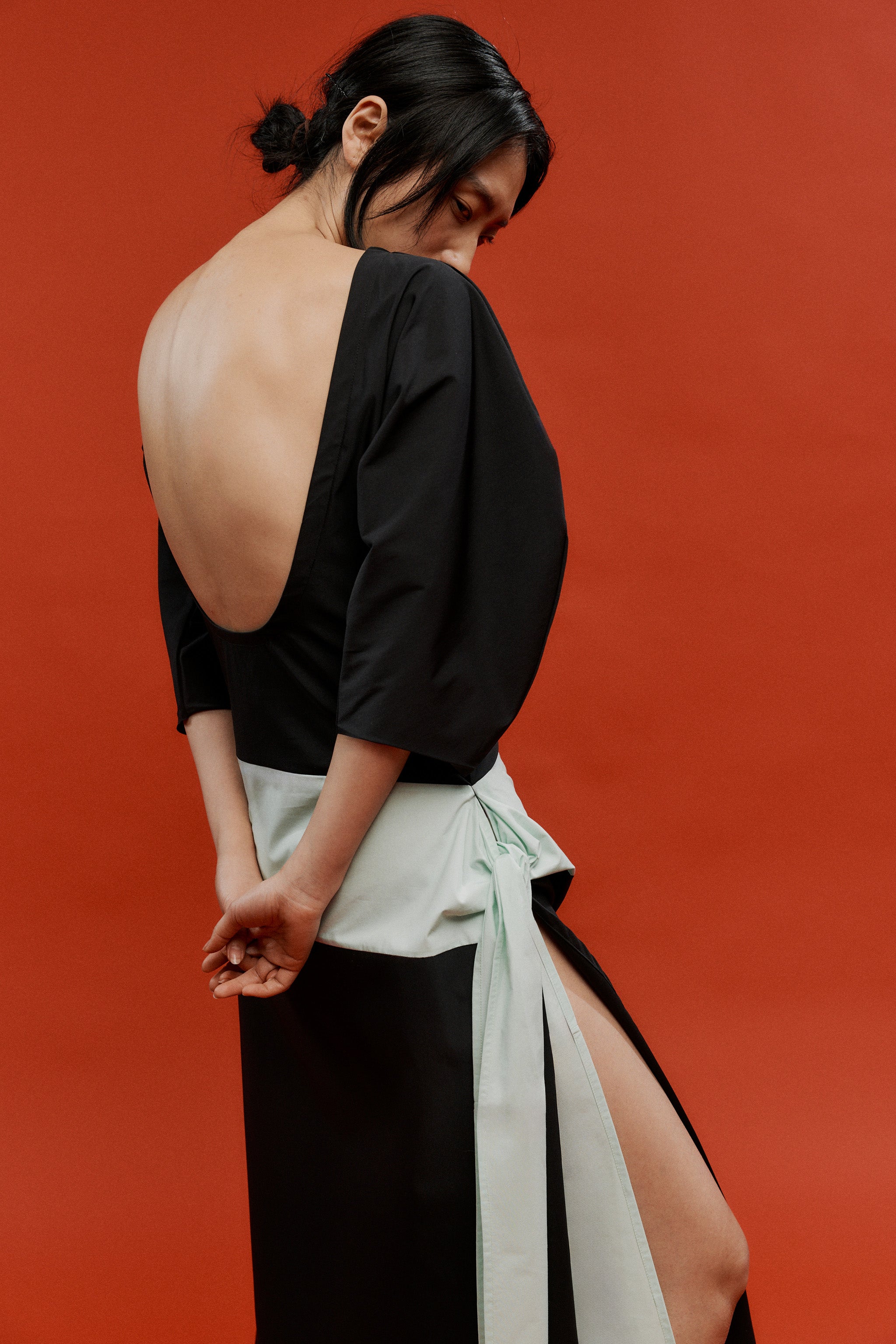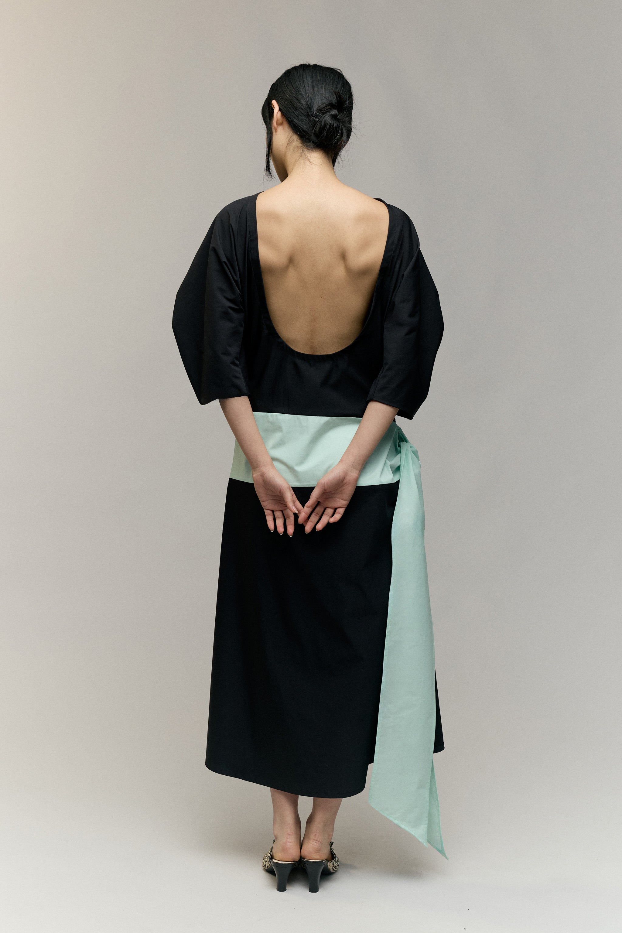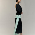 The Moon Dress - a curved, elbow-length sleeve and low-back silhouette, defined by a mint waist detail that ties softly at the side, opening into a subtle side split. A piece made for evenings that call for quiet drama and effortless elegance.