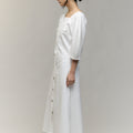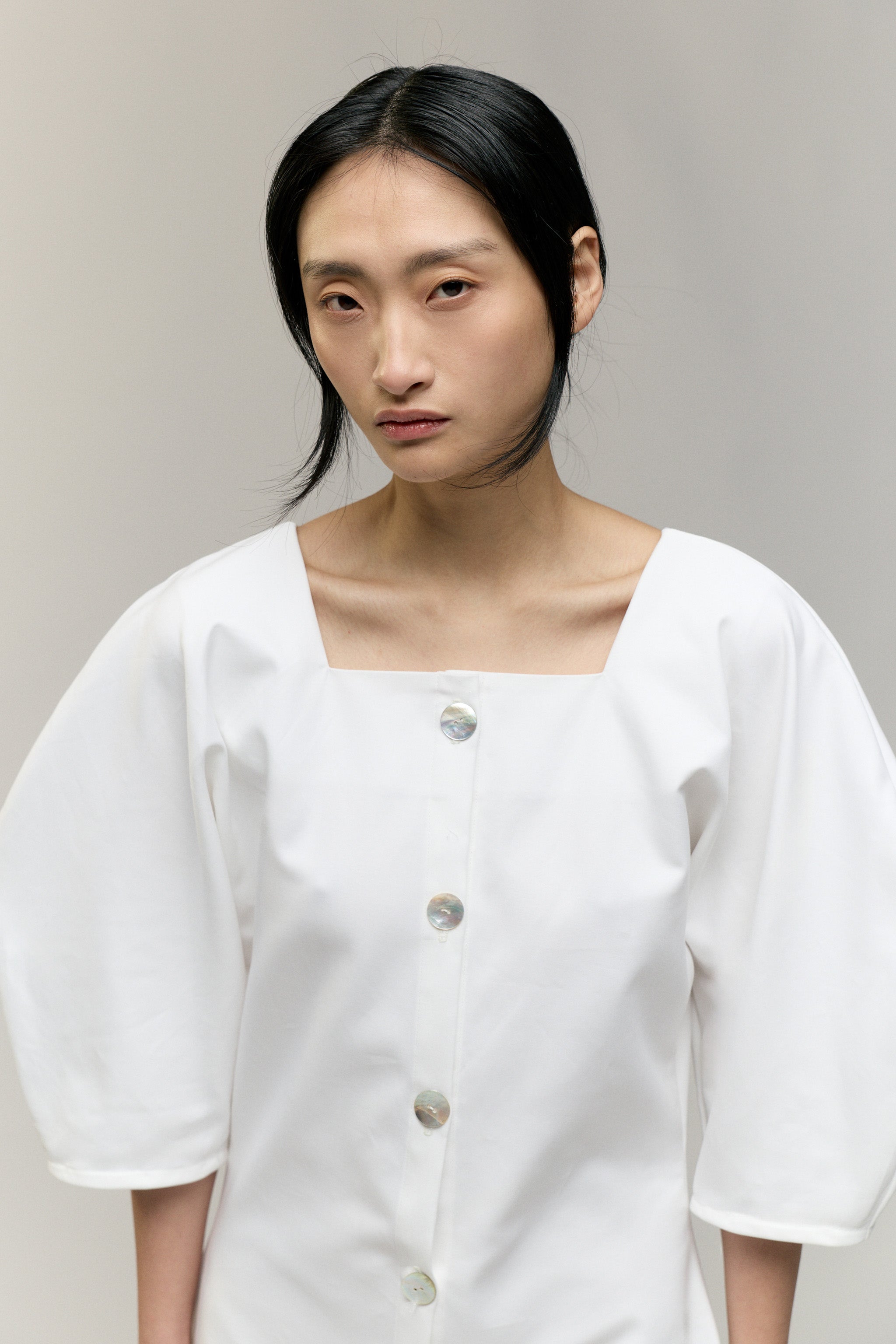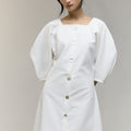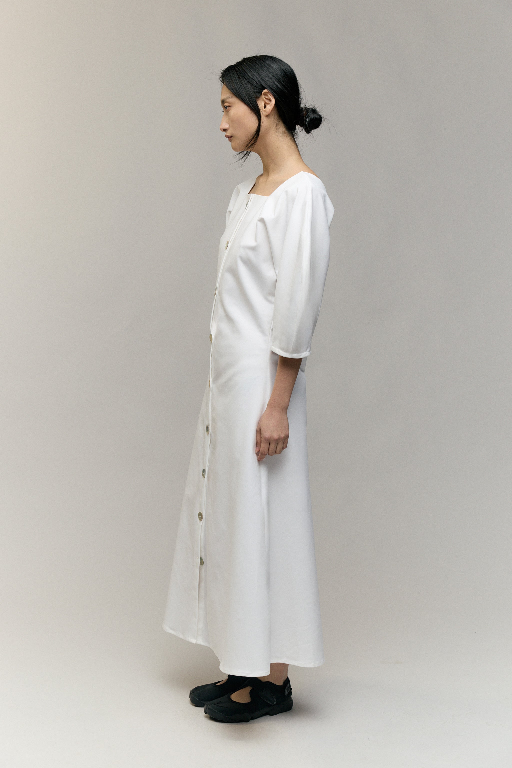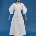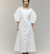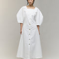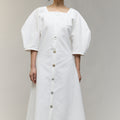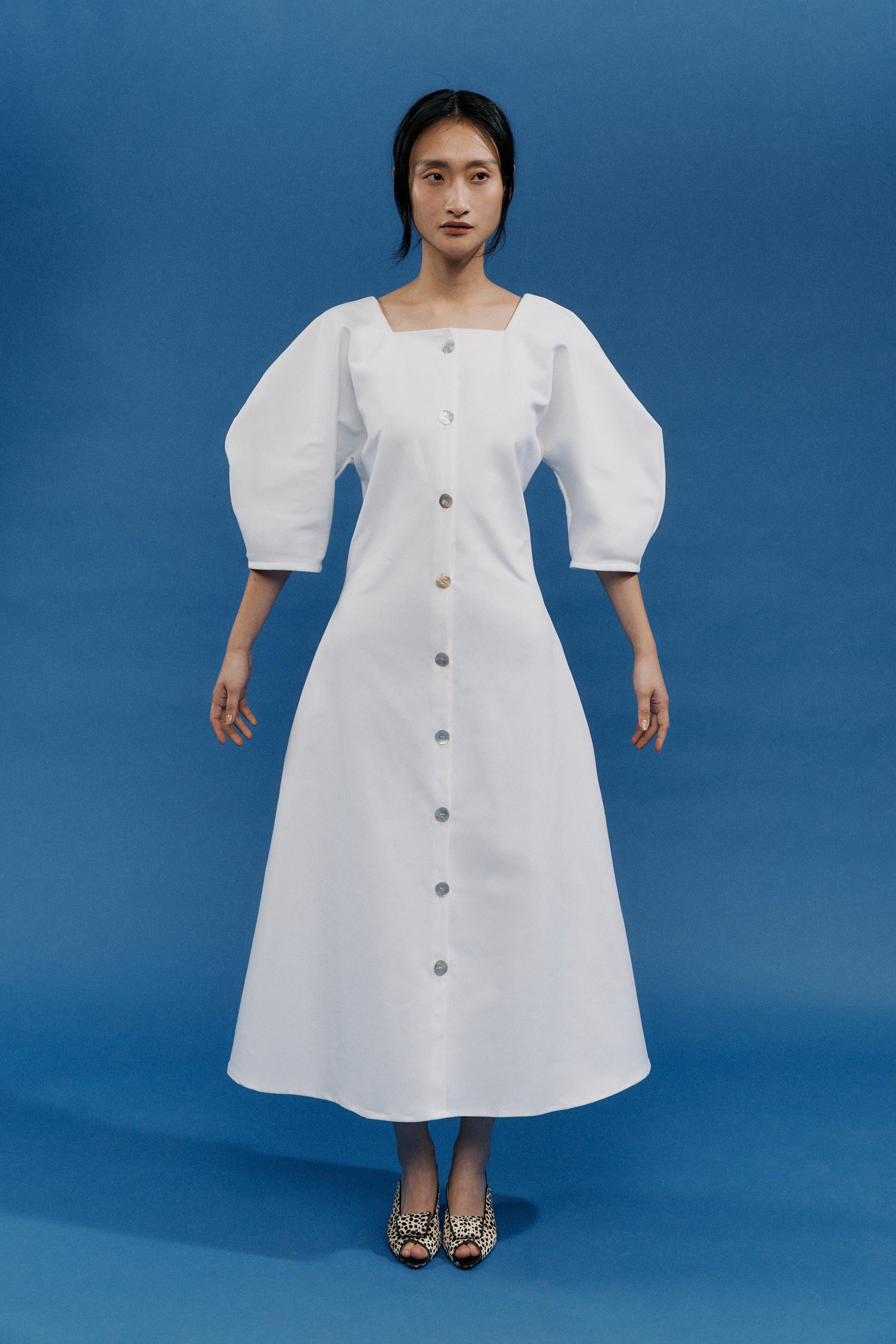 A signature shape from our core collection, the Sweet Puff Dress features a gentle curved elbow sleeve, a soft square neckline, and finishes at high ankle. Designed to be worn, loved, and passed on.